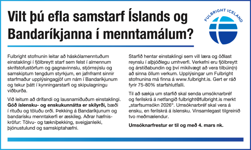 Fulbright Iceland – supporting Icelandic-U.S. partnership in education, science and the arts since 1957. We build bridges to bring a little more knowledge, reason and compassion to the world.