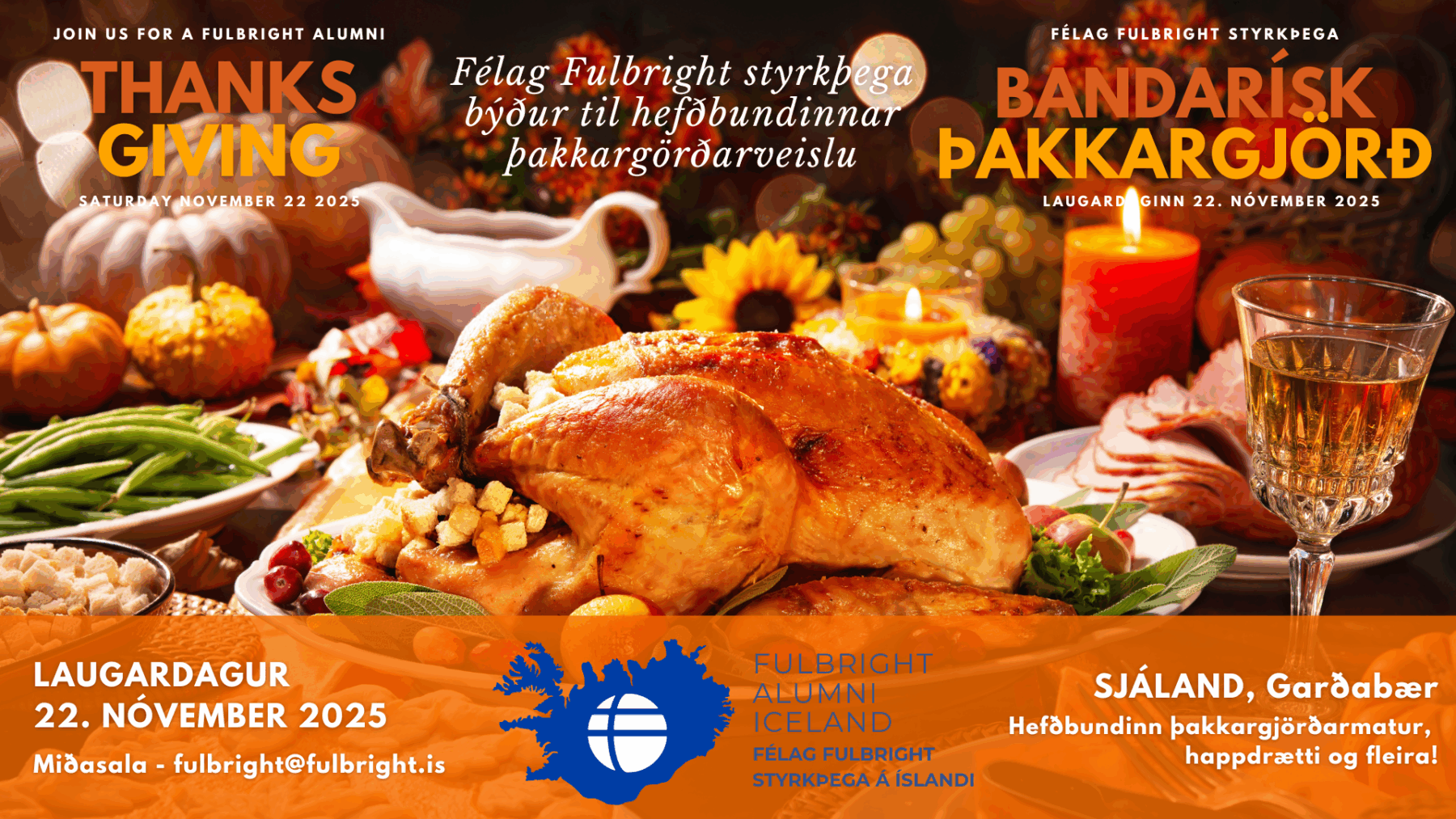 Laugardaginn 22. nóvember verður Þakkargjörðarhátíð Félags Fulbright styrkþega haldin í Sjálandi (Ránargrund 4, 210 Garðabær).