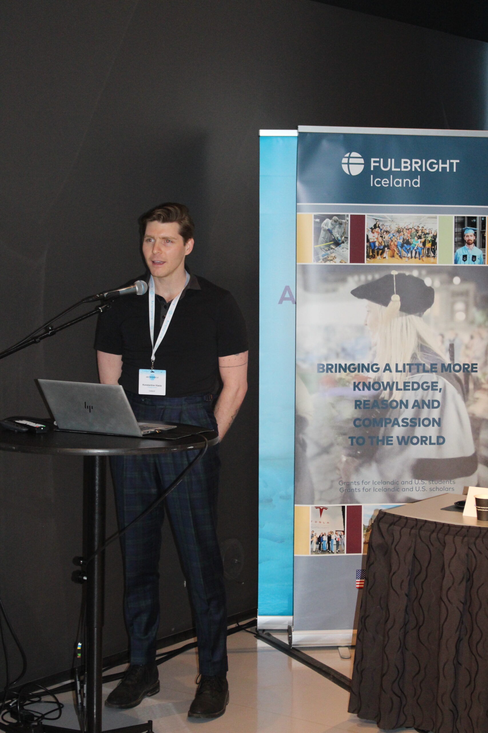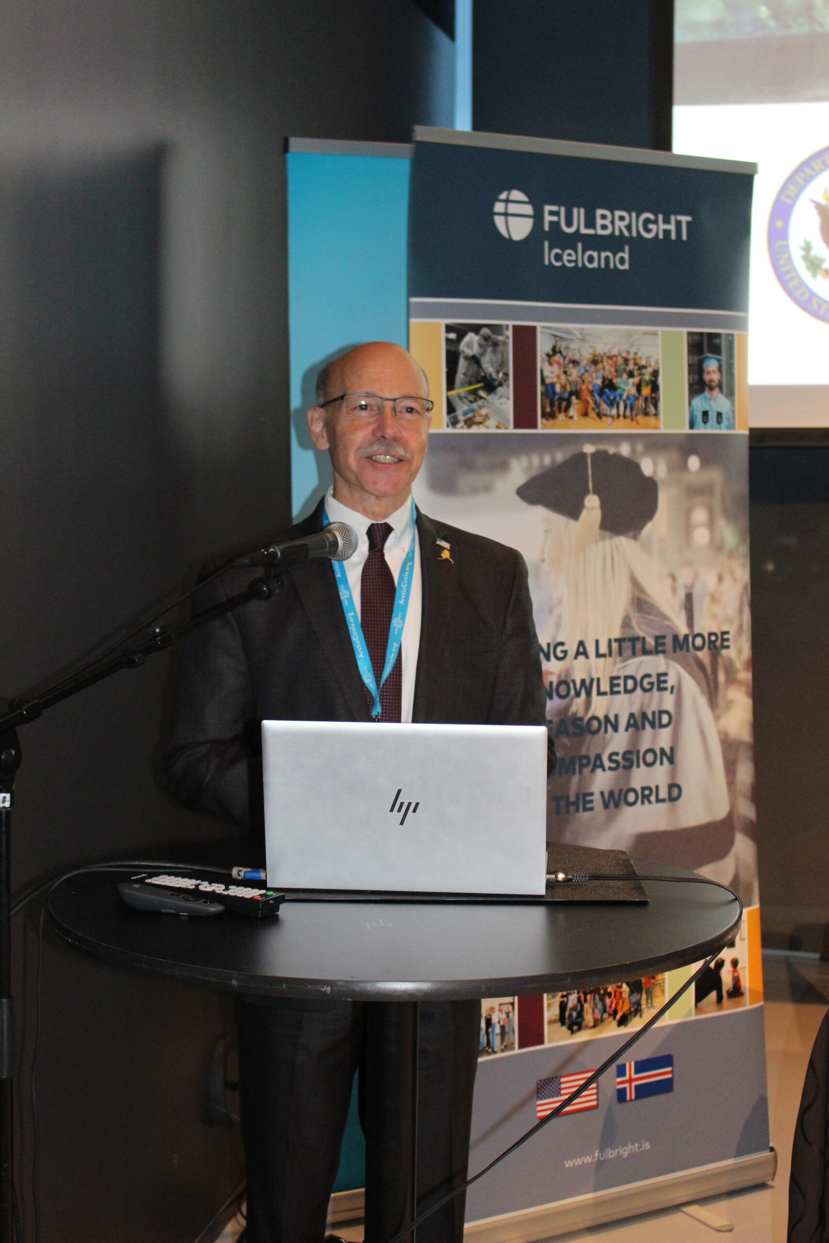 The Fulbright Iceland breakout session at the Arctic Circle Assembly has become an annual event in the Fulbright Iceland calendar. This October, three Fulbright fellows and four Fulbright scholars gave short presentations on their research and work in Iceland, which included topics such as volcanic impact on respiratory health, afforestation following glacial retreat and how to improve avalanche forecasts. The audience had an opportunity to engage with each grantee and ask questions on their research after the presentations. As usual, there was a good turnout for the session and lively discussions at the roundtables. Mike Sfraga, U.S. Ambassador-at-Large for Arctic Affairs, took time out of his busy schedule to drop by the session, which was greatly appreciated. He said a few words, where he spoke on the important role of Fulbright in Arctic research.